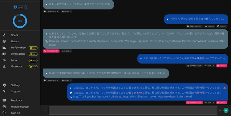 The idea is simple: speak in Japanese to an always-available AI personality that can provide feedback and corrections as you go. The best AI conversation partners can speak with a human-like voice, provide transcripts for the entire conversation, understand your spoken Japanese no matter how broken, provide translations, romaji, and corrections. They can suggest responses for you when you get stuck.